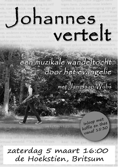 Jan Jaap Wubs speelt de voorstelling 'Johannes vertelt”. Een muzikale wandeltocht door het evangelie van Johannes. Een voorstelling in de vorm van liedjes, persoonlijke verhalen en overdenkingen, en het evangelie van Johannes als 'kapstok'. Zo krijgt Johannes' boodschap een nieuwe vorm. Maar de inhoud, die blijft natuurlijk hetzelfde. Het gaat over thema's als geloof, vergeving en liefde, maar ook over twijfel, vragen en (her) ontdekkingen.