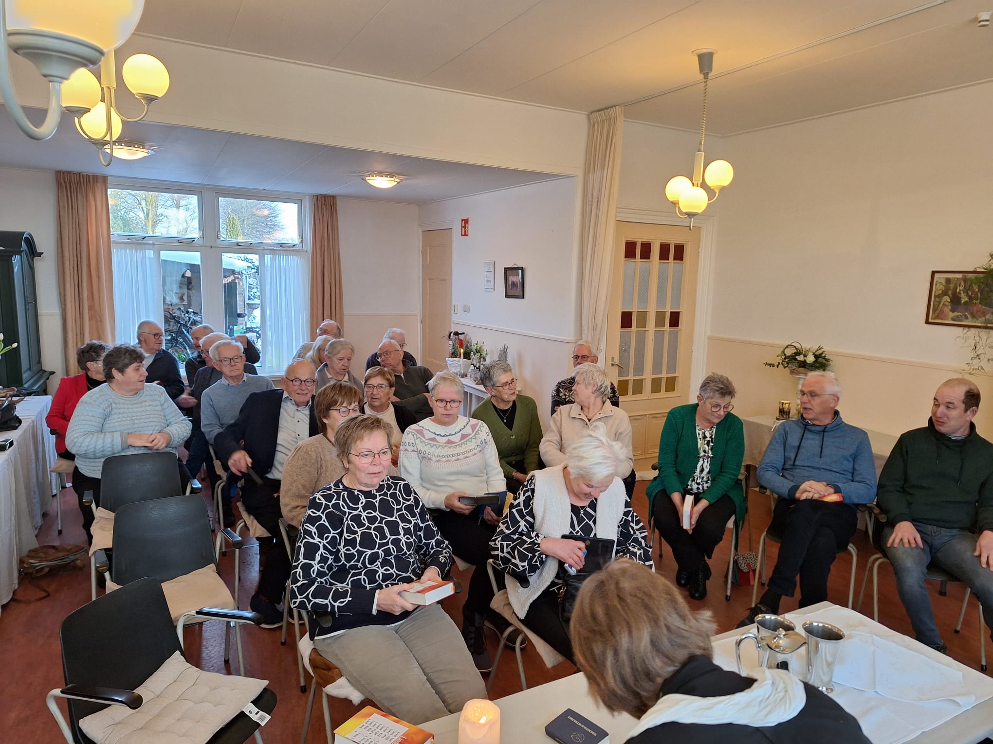 In verband met de winterse omstandigheden hebben we zondagochtend de dienst verplaatst naar de Consistorie in Jelsum. Hierbij een sfeerfoto.